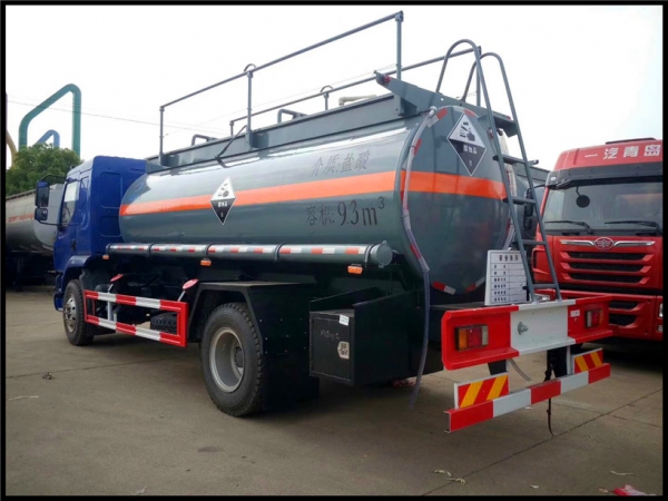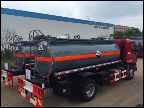 罐体采用碳钢制作外壳,厚度符合国标GB18564,衬塑后水容积10方左右,罐体截面正圆形,罐体内部通过钢网过度,内衬聚乙烯16MM厚,钢衬塑双隔板结构,罐顶1个全塑进料口,1个呼吸阀,带碳钢折叠护栏,罐顶带围边,围边内沥青防腐处理。罐体后尾部底口处1个DN100不锈钢内衬四氟紧急切断阀带紧急开关后保险杠控制,通过衬塑三通管道,后尾部左右各1个DN80塑料球阀带塑料出口。1个工具箱,PVC炮筒管2根,灭火器2只。罐体后尾部爬梯1只。