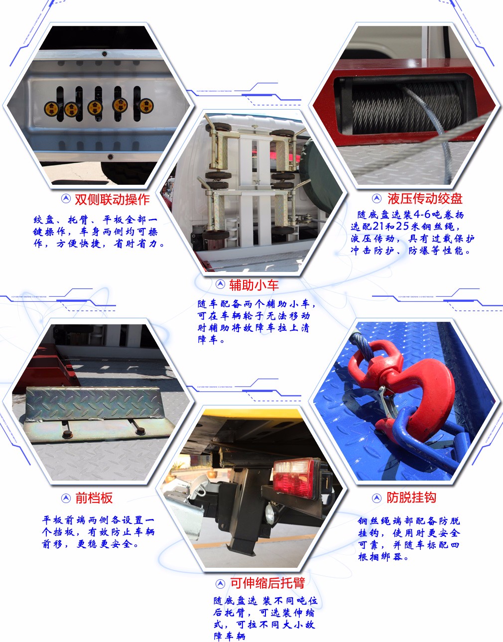 上装配置:平板采用3P2A冲压钢板,具有更加出众的平衡性,平板长4.2米,宽2.3米。背3吨,拖3吨。多路阀平衡阀采用意大利原装(海德)进口;液压缸佛山(海战力)采用德国技术,双层钢丝液压胶管,全进口密封圈。分体模压拼焊面板,耐磨、防滑抗阻力强。双侧联动操作系统,后工作灯2只,一个4吨液压绞盘(25米钢丝绳)一个洗手箱,2个小车,L型抱胎架1对,4根捆绑带,后隐藏液压伸缩式尾板,或尾部翻转(可定做中间加长0.5米),可伸出长度为1.1米,应对较长车型的SUV和越野车型。上装所有液压元件均采用进口部件,可选装国产件。